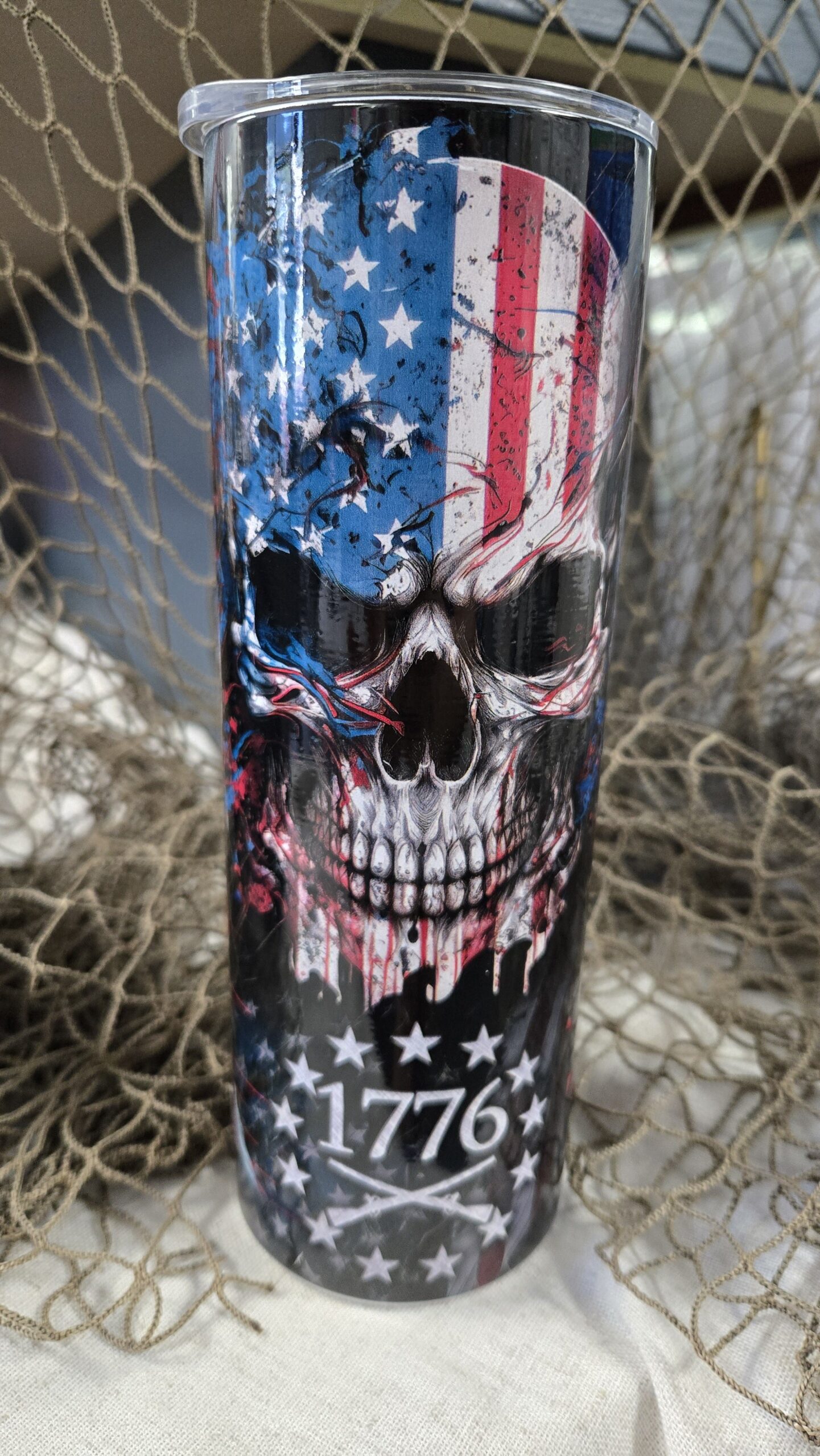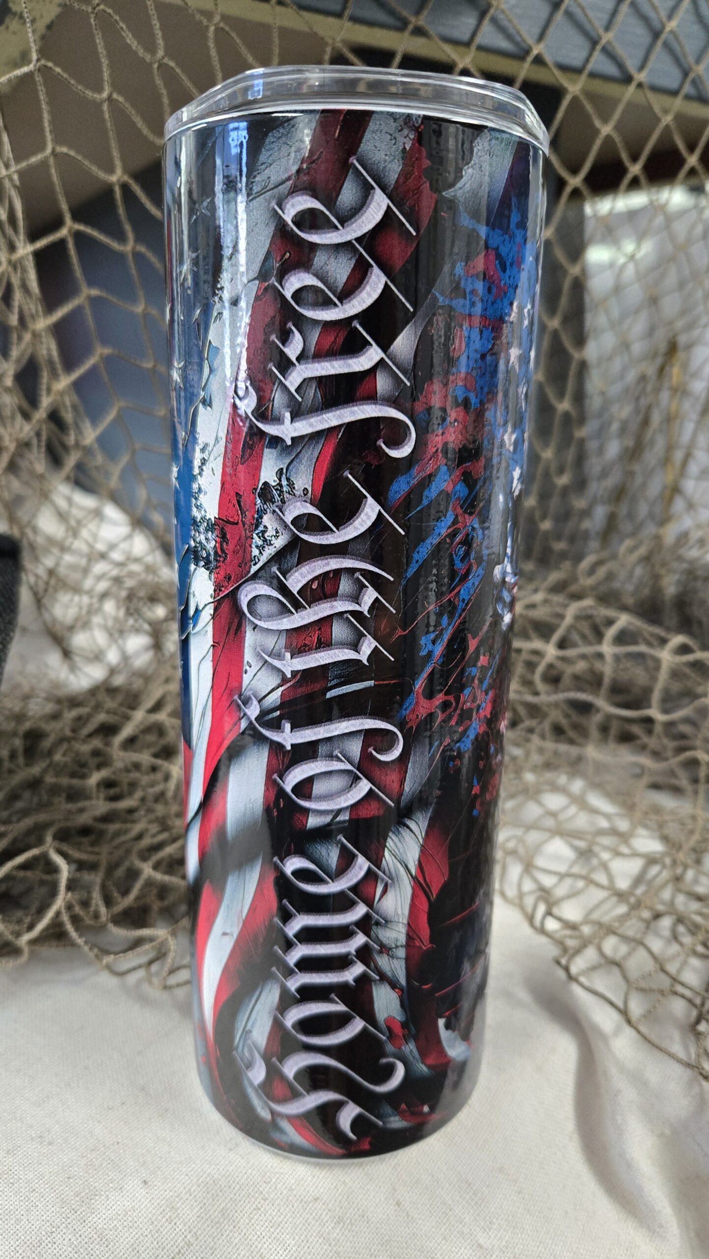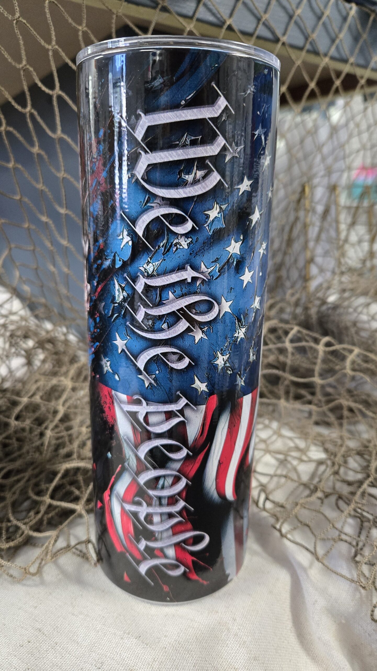This is a 20 oz tall version tumbler with UV printed “We the people” theme. Dishwasher safe top rack, 11hrs hot and 12+ cold. High quality tumbler, vibrant printed colors.